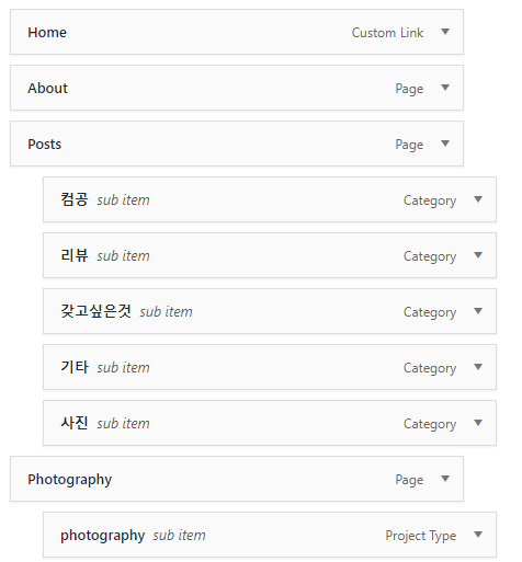 이런식으로 블로그를 정리한다면 더 편할 테니까. Blask는 이를 지원하지는 않지만 대신 portfolio의 type/tag를 각 게시글 마다 설정한 뒤, 워드프레스 메뉴 설정에서 각각의 type/tag를 추가해주면 된다.